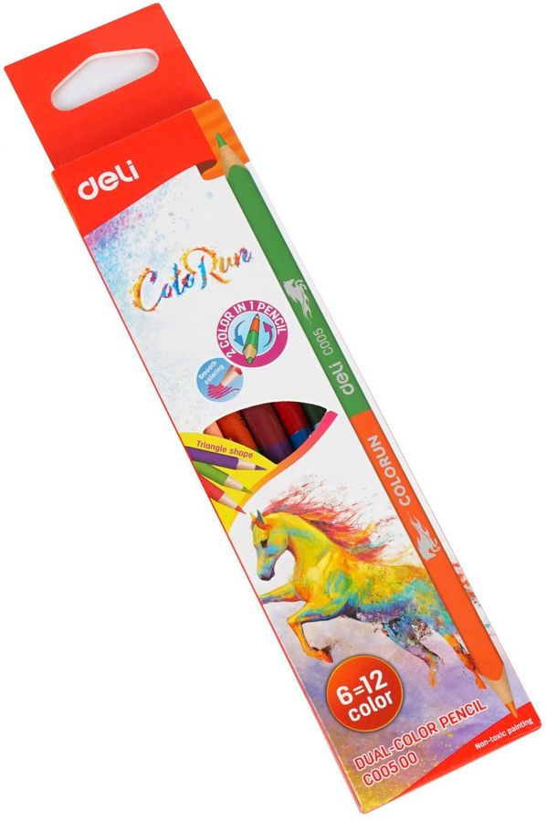 Цветные карандаши двусторонние Deli ColoRu отлично подходят для эффектных скетчей и иллюстраций. Эргономичная трехгранная форма корпуса создает дополнительный комфорт при использовании. Цвет стержня и корпуса карандаша совпадает. Это удобно, не промахнешься выбирая нужный оттенок. Тонкий, мягкий, прочный и не крошащийся грифель хорошо затачивается. Карандаши хорошо смешиваются, 100% интенсивность окрашивания и легкость нанесения. Карандаши содержат пигмент профессионального качества. Устойчивы к воздействию света. Удобная коробка с европодвесом идеально подходит для того, чтобы брать с собой карандаши в школу или в путешествие. Карандаши изготовлены из высококачественной древесины. Карандаши предварительно заточены. Отличный подарочный вариант. В наборе: 6 шт