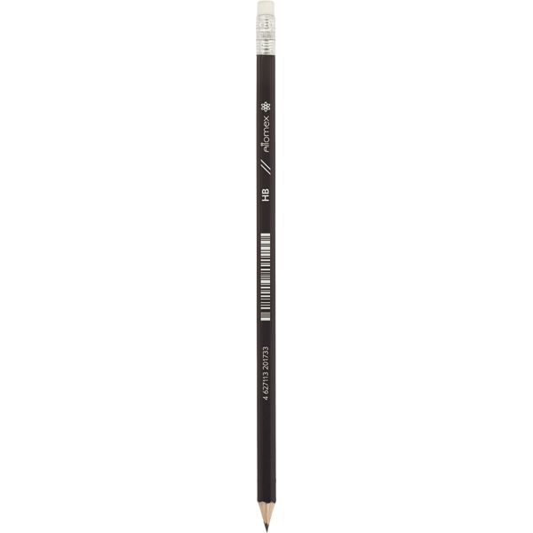 Карандаш чернографитный "Attomex" HB, диаметр грифеля 2 мм, шестигранный, с ластиком, заточенный, индивидуальная маркировка, пластиковый черный корпус.