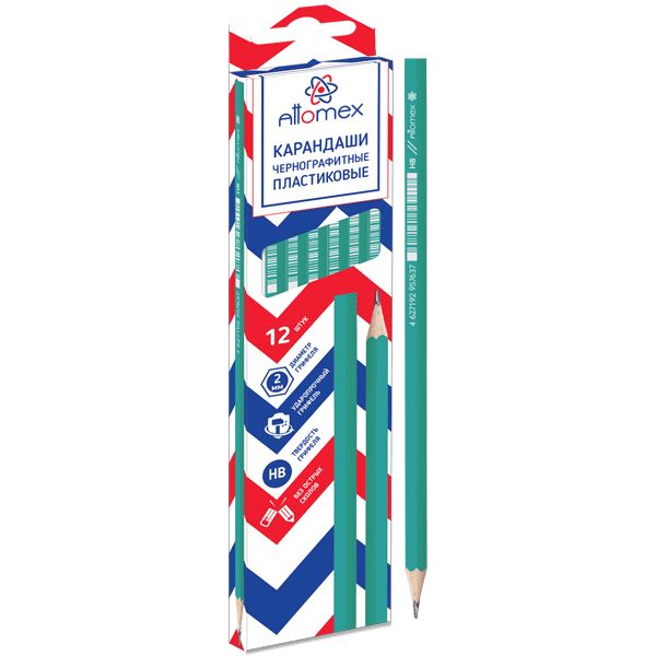 Карандаш чернографитный "Attomex" HB, диаметр грифеля 2 мм, шестигранный без ластика, индивидуальная маркировка, пластиковый зеленый корпус.