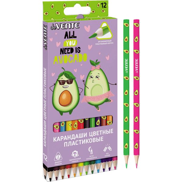 Карандаши цветные пластиковые "deVENTE. Avocado" 12 цветов, 2М, диаметр грифеля 3 мм, трёхгранные, пластиковый корпус c запечаткой, в картонной коробке с эффектом Soft Touch