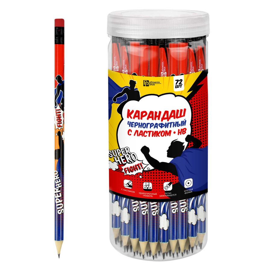 Карандаш чернографитный арт. 57942 / 72 СУПЕРГЕРОЙ (ПЭТ-тубус, 72 шт., ассорти, твердость грифеля: HB, размер: 188*7,5 мм, форма корпуса: круглая, материал корпуса: светлое дерево, покрытие корпуса: матовое прозрачное, цвет корпуса: синий, отделка: полноцветная печать, наличие ластика: Да, диаметр грифеля: 2 мм, заточено: Да