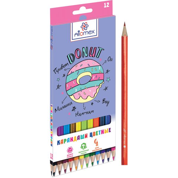 Карандаши цветные "Attomex. Donut" 12 цветов, М, диаметр грифеля 2,65 мм, шестигранные, в картонной коробке
