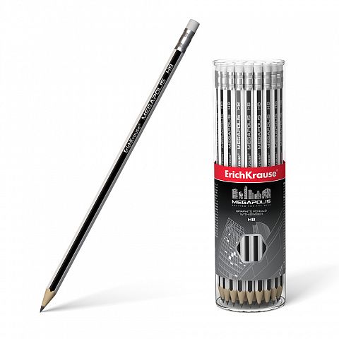 Чернографитный трехгранный карандаш с ластиком ErichKrause® MEGAPOLIS HB (в тубусе по 42 шт.)