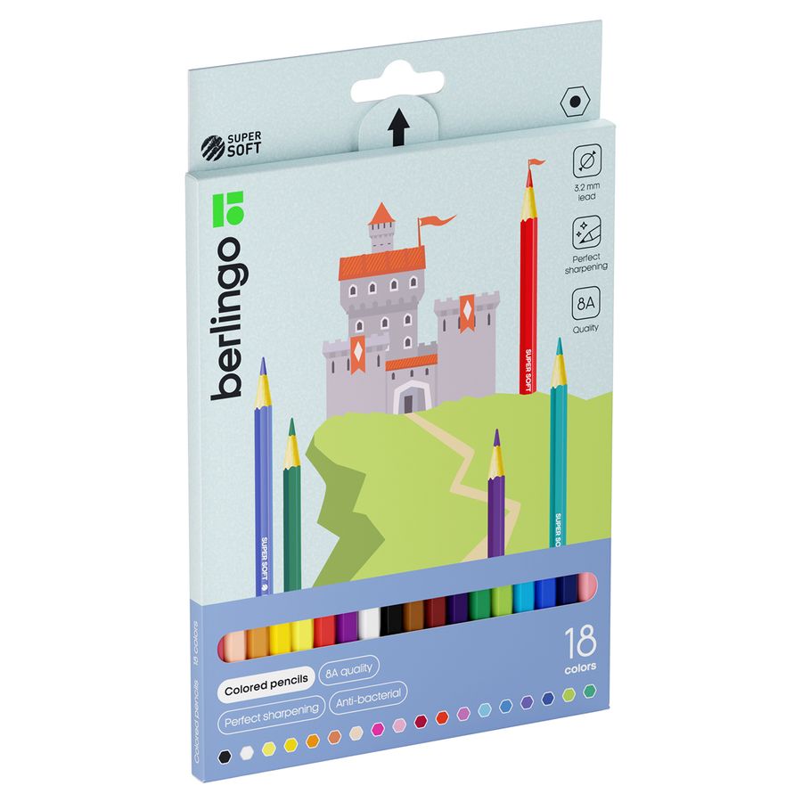 "SuperSoft" - линейка качественно новых цветных карандашей Berlingo. 18 цветов. Эргономичная трехгранная форма. Указание цвета на каждом карандаше на английском языке. Поле для подписи имени владельца на каждом карандаше. Упаковка в плотную матовую картонную коробку со склеенным европодвесом. Пластиковый трей внутри предотвращает скатывание карандашей и позволяет легко собирать их в коробку. Грифели высочайшего стандарта качества 8А, являющегося максимальным для нехудожественных цветных карандашей. Мягкость письма, сравнимая с рисованием маслом и пастелью. Яркие насыщенные цвета, обладающие превосходной смешиваемостью. Увеличенная до 3,2 мм толщина грифеля для безупречно комфортного раскрашивания. Уникальная формула и технология производства грифелей, в результате которой достигается одновременно удивительная мягкость письма и прочность, позволяющая грифелю выдерживать даже сильное нажатие под углом 45 градусов. Специальная проклейка, предотвращающая поломку грифеля внутри карандаша при падении. Стойкость к повреждениям. Корпус из древесины высшего качества, прошедшей тщательную обработку. Материал, сохраняющий свою прочность и легко поддающийся ровной заточке без усилий. Уникальная антибактериальная обработка на специализированном оборудовании, гарантирующая безопасное использование продукции детьми.