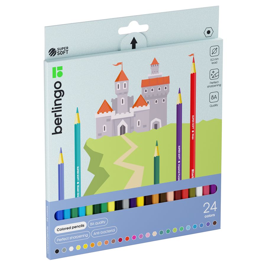"SuperSoft" - линейка качественно новых цветных карандашей Berlingo. 24 цветов. Эргономичная трехгранная форма. Указание цвета на каждом карандаше на английском языке. Поле для подписи имени владельца на каждом карандаше. Упаковка в плотную матовую картонную коробку со склеенным европодвесом. Пластиковый трей внутри предотвращает скатывание карандашей и позволяет легко собирать их в коробку. Грифели высочайшего стандарта качества 8А, являющегося максимальным для нехудожественных цветных карандашей. Мягкость письма, сравнимая с рисованием маслом и пастелью. Яркие насыщенные цвета, обладающие превосходной смешиваемостью. Увеличенная до 3,2 мм толщина грифеля для безупречно комфортного раскрашивания. Уникальная формула и технология производства грифелей, в результате которой достигается одновременно удивительная мягкость письма и прочность, позволяющая грифелю выдерживать даже сильное нажатие под углом 45 градусов. Специальная проклейка, предотвращающая поломку грифеля внутри карандаша при падении. Стойкость к повреждениям. Корпус из древесины высшего качества, прошедшей тщательную обработку. Материал, сохраняющий свою прочность и легко поддающийся ровной заточке без усилий. Уникальная антибактериальная обработка на специализированном оборудовании, гарантирующая безопасное использование продукции детьми.
