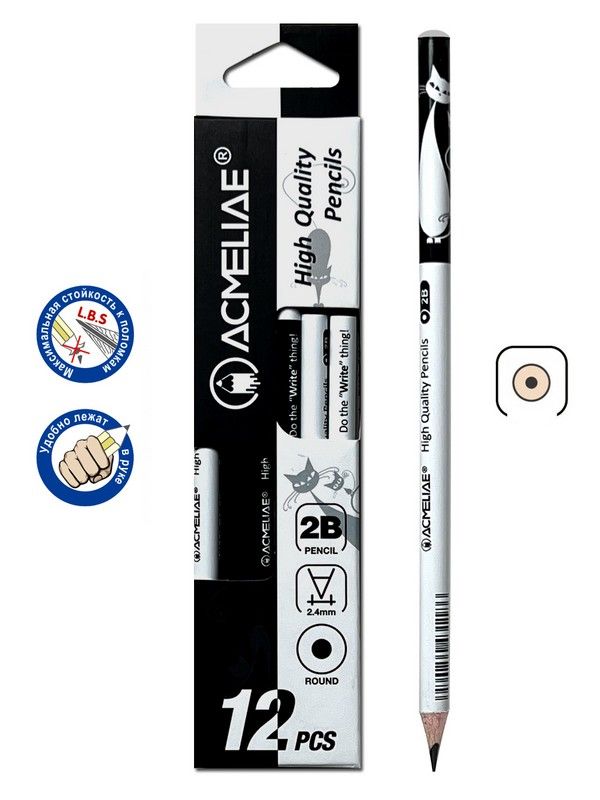 Набор качественных простых чернографитных карандашей 12 штук для школы, письма, черчения, рисования, эскизов, графики, скетчей. Грифель графитового канцелярского карандаша полностью соединен с древесиной корпуса, составляя с ней одно целое, что предотвращает его поломки при падении и затачивании. Чернографитовый мягкий карандаш не царапает бумагу, оставляет четкие яркие линии. Твердость грифеля 2В мягкий. Круглый корпус из высококачественной древесины тополя ровно и аккуратно затачивается стандартными точилками. Длина корпуса 178мм. Диаметр грифеля 2,4 мм. Заточенный. Цвет корпуса – белый, черный, рисунок Кошки.