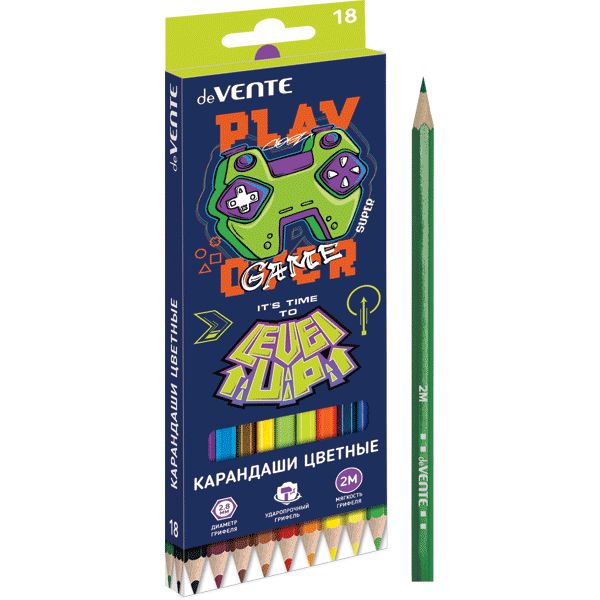 Карандаши цветные "deVENTE. Level Up Game" 18 цветов, 2М, диаметр грифеля 2,8 мм, шестигранные, в картонной коробке.