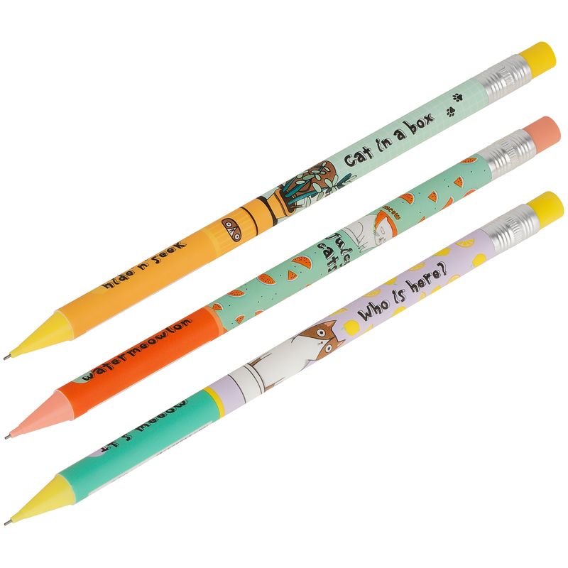 Механический карандаш с печатью на корпусе и ластиком MESHU Jucy cats станут отличными помощниками в школе или офисе. Круглый корпус выполнен в стильных, ярких дизайнах, рисунки нанесены высококачественной термотрансферной печатью. Диаметр грифеля – 0,7 мм, твердость – HB, материал корпуса – пластик. Карандаши упакованы в пластиковую тубу по 24 штуки. Подача грифеля осуществляется с помощью кнопочного механизма.Стильные яркие дизайны понравятся всем любителям милой и забавной канцелярии.• Твердость: HB;• Форма корпуса: круглая;• Наличие ластика: да;• Цвет корпуса: ассорти;• Количество штук в упаковке: 24;• Тип упаковки: пластиковая туба.