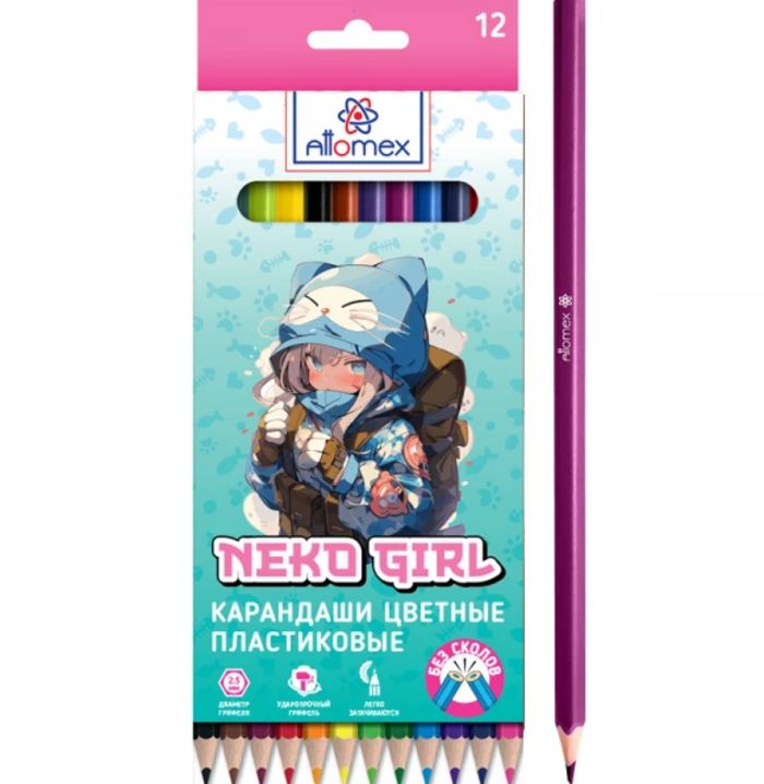 Карандаши цветные пластиковые "Attomex. Neko Girl" 12 цветов, 2М, диаметр грифеля 2,5 мм, шестигранные, в картонной коробке