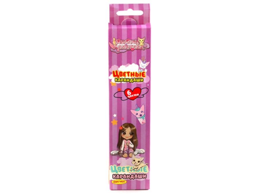 Набор цветных карандашей, 6 цветов. Заточенный грифель диаметром 3 мм. Яркие насыщенные цвета. Изготовлены из белого тополя. Корпус покрыт лакокраской в 8 слоев и отделан серебристой фольгой. Легко затачиваются. Трехгранное сечение карандаша обеспечивает удобное пользование. Картонная коробка с европодвесом.