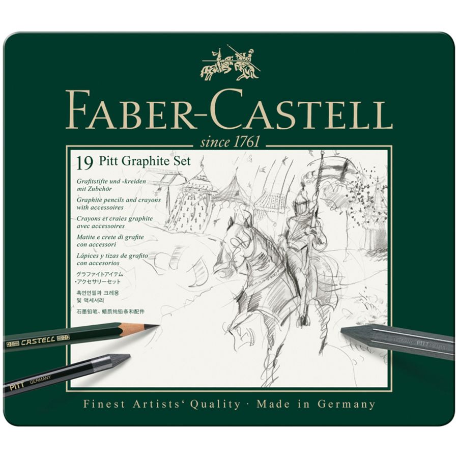 Набор профессиональных художественных чернографитных письменных принадлежностей Pitt Graphite от легендарного немецкого производителя Faber-Castell. Набор состоит из 3 чернографитных карандашей Castell 9000 твердостью 2B, 4B и 8B, 3 чернографитных карандашей в утолщенном корпусе Castell 9000 Jumbo твердостью 2B, 4B и 8B, 3 акварельных чернографитных карандашей Graphite Aquarelle твердостью 2B, 4B и 8B, 3 чернографитных карандашей Pitt Graphite Pure твердостью 3B, 6B и 9B, 2 чернографитных мелков Pitt Graphite crayon твердостью 6B и 9B, кисти, 2 ластиков, точилки и растушевки.