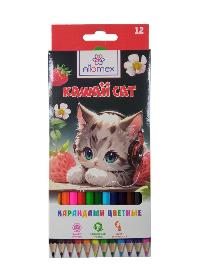Карандаши цветные "Attomex. Kawaii Cat" 12 цветов, М, диаметр грифеля 2,65 мм, шестигранные, в картонной коробке