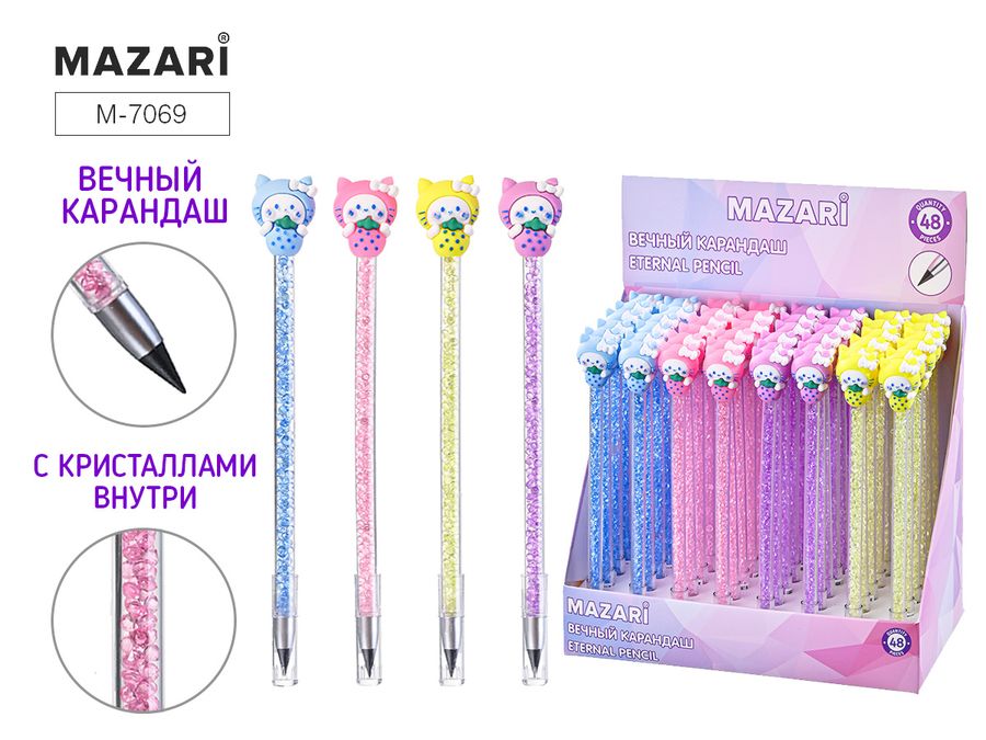 Карандаш чернографитный вечный HB Кошечка корпус с кристаллами ассорти MAZARI M-7069