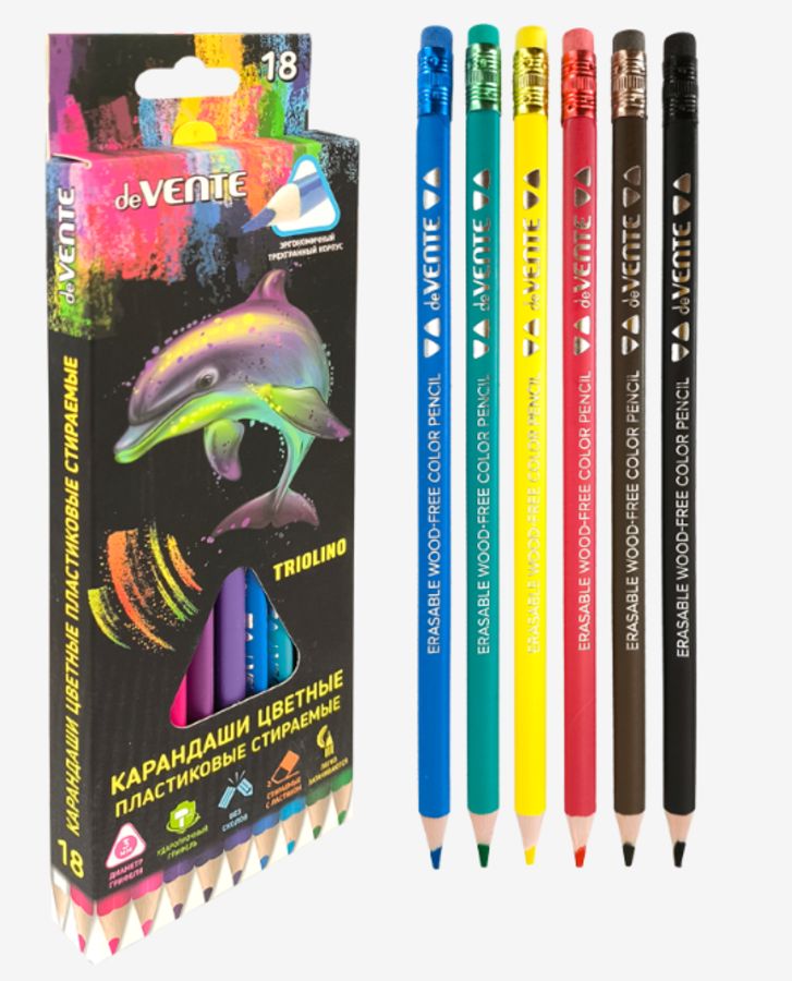 Карандаши цветные пластиковые "deVENTE. Triolino. Erase" стираемые, 18 цветов, 2М, диаметр грифеля 3 мм, трёхгранные, пластиковый корпус, с ластиком, в картонной коробке