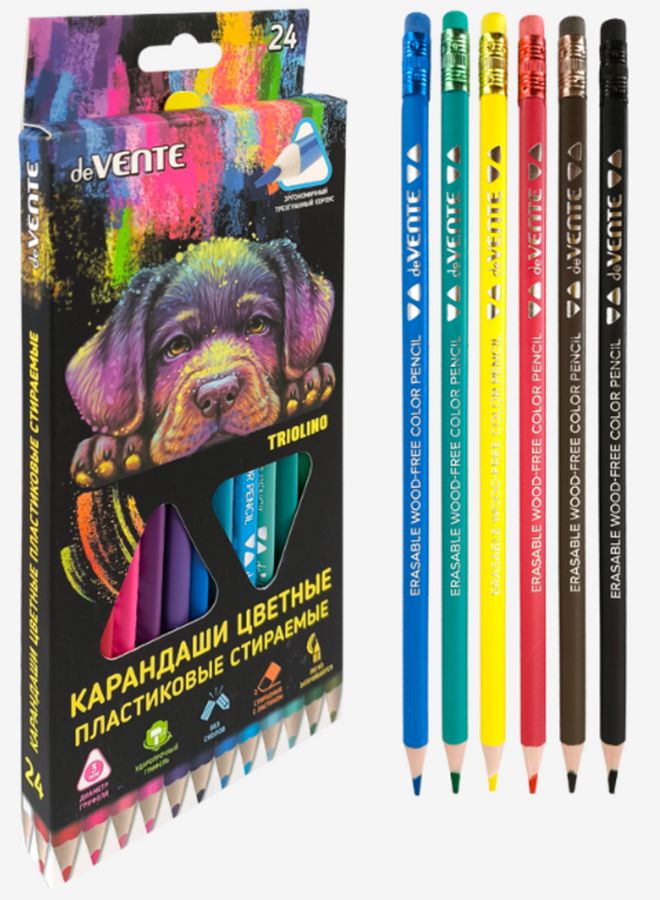 Карандаши цветные пластиковые "deVENTE. Triolino. Erase" стираемые, 24 цвета, 2М, диаметр грифеля 3 мм, трёхгранные, пластиковый корпус, с ластиком, в картонной коробке