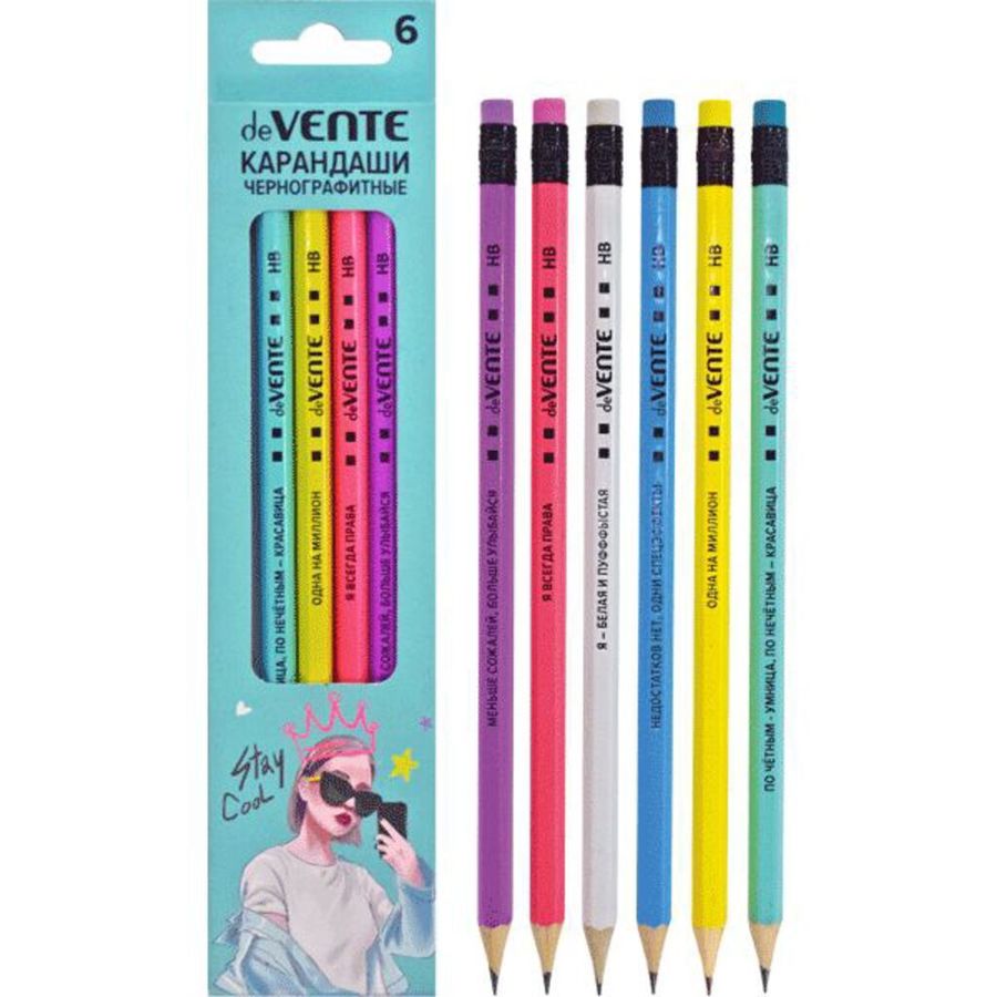 Карандаш чернографитный "deVENTE. Lady Perfection" 06 шт (HB) диаметр грифеля 2 мм, шестигранный корпус с ластиком, цвета корпуса ассорти пастель, в картонной коробке