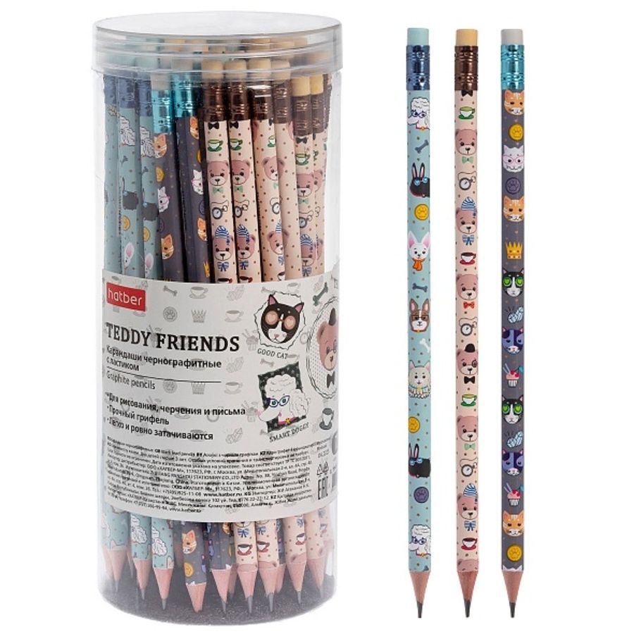 Карандаш чернографитный HB Teddy Friends дерево ассорти с ластиком HATBER BL_086458