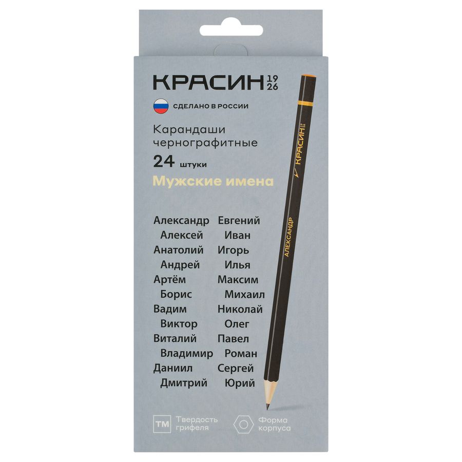 Карандаши чернографитные «Красин» серии «Мужские имена» - это замечательный повод порадовать близкого человека или себя маленьким презентом, знаком внимания. Идеально подходят как для офиса, так и для школы. Благородный внешний вид, классический черный цвет и золотое тиснение, сделают карандаш стильным аксессуаром на столе. Корпус выполнен из древесины липы высокого качества, грифель устойчив к повреждениям. В наборе 24 мужских имени. Индивидуальный ШК на каждом карандаше. Набор поставляется в картонной коробке с европодвесом.