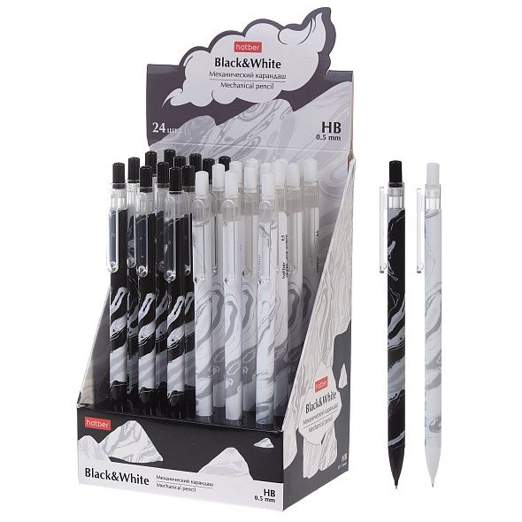 Механический карандаш с мраморным дизайном. Тонкий, легкий, удобный. Простой надежный механизм. С клипом. Диаметр грифеля 0,5 мм.Твердость: НВ. Упаковка: картонный дисплей 24 шт.