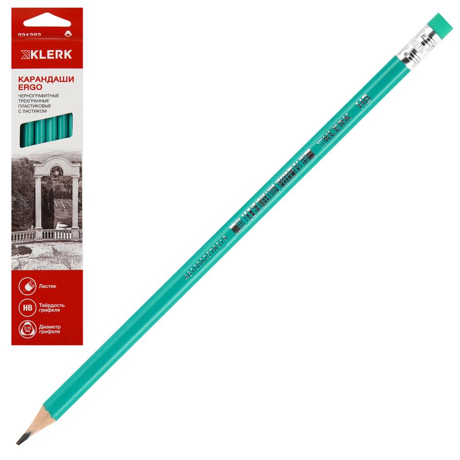 Карандаш чернографитный HB Ergo трехгранный пластик зеленый с ластиком KLERK 231383