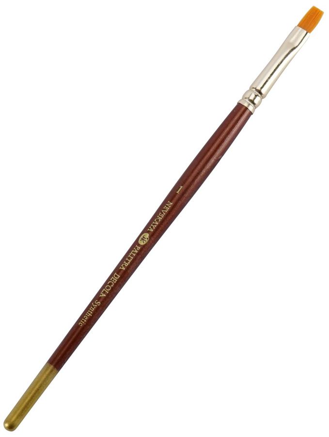 Кисть из синтетики, плоская, с пластиковой ручкой, №1 (6 мм) Кисть синтетическая с пластиковой ручкой, плоская. Для нанесения широких ровных мазков. Благодаря густоте и длине волоса, кисть удерживает много краски.Используется для декоративных работ. Произведено в Индии.