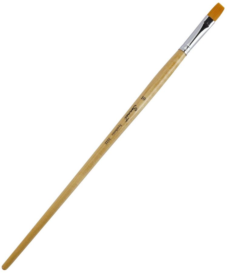 Синтетика, плоская, с длинной деревянной ручкой пропитанной лаком. Кисти из синтетики созданы из тонкого химического волокна с острой вершинкой. Хорошая упругость и острые кончики этих кистей при невысокой стоимости делают их достойной альтернативой традиционным кистям из волоса колонка. Предназначены для работ с тяжелыми красками: маслом, акрилом, темперой, гуашью; хорошо удерживают жидкость