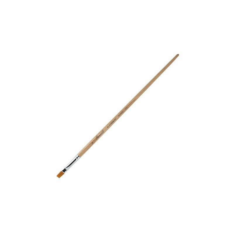 Синтетика, плоская, с длинной деревянной ручкой пропитанной лаком. Кисти из синтетики созданы из тонкого химического волокна с острой вершинкой. Хорошая упругость и острые кончики этих кистей при невысокой стоимости делают их достойной альтернативой традиционным кистям из волоса колонка. Предназначены для работ с тяжелыми красками: маслом, акрилом, темперой, гуашью; хорошо удерживают жидкость