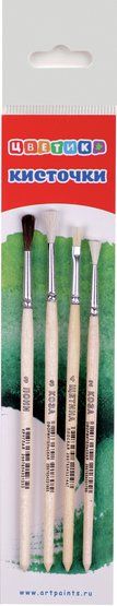 Наборы кистей «Цветик» прекрасно подойдут для юных живописцев. Каждый набор имеет подробную аннотацию и снабжён таблицей, благодаря которой можно безошибочно подобрать номер и тип кисти для выполнения конкретной работы. В набор входят: щетина плоская №4 коза круглая №2 коза круглая №3 пони круглая №3