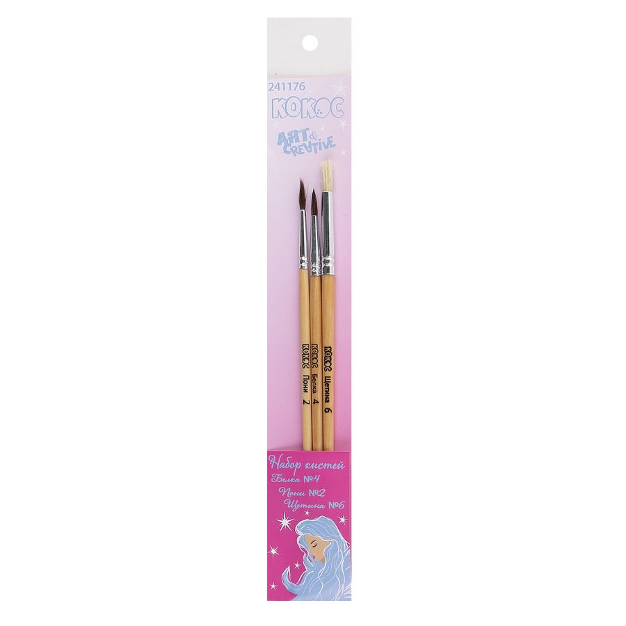 Набор кистей 3 шт, Белка круглая №4, Пони круглая №2, Щетина круглая №6 Ангел КОКОС 241176