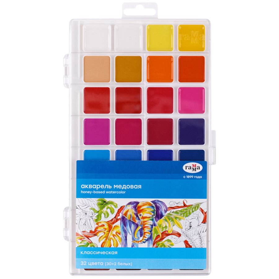 Медовая полусухая акварель ГАММА серии «Классическая» разработана для использования в школе и дома. Естественные цвета акварели обучают правильному цветовосприятию окружающего мира. Краски изготовлены на основе органических пигментов и натурального связующего. Прозрачность красок, яркость и чистота цвета, разносимость и размываемость — основные характеристики акварели данной серии. Кюветы с высокими бортиками и увеличенным расстоянием между красками предназначены для удобства в работе детей. Палитра для смешивания красок расположена на крышке. Акварель легко смывается с рук и отстирывается с одежды. Яркие краски 32 цветов разделены надёжными кюветами, благодаря которым цвета не смешаются при работе. Цветовая палитра разработана совместно с Центром непрерывного художественного образования. • Количество цветов: 32;• Форма кюветы: квадратная;• Объём кюветы: 3,14 см3.