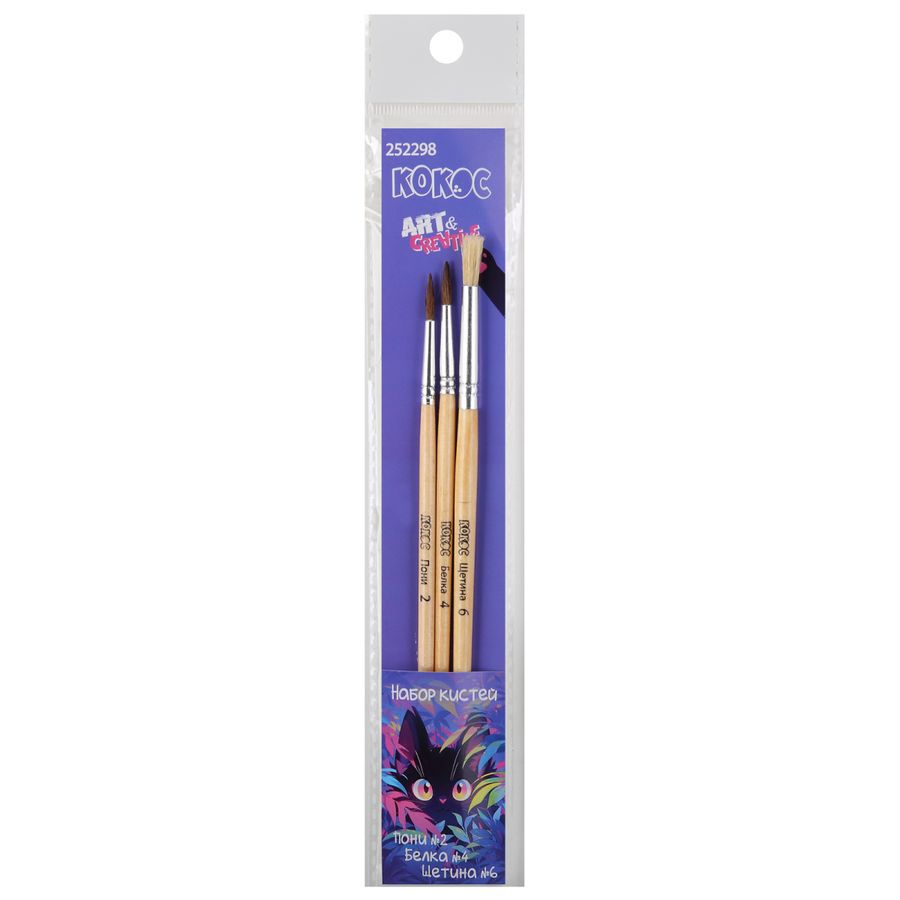 Кисть набор 3шт белка №4, пони №2, щетина №6 круглые Tropical cat Кокос 252298