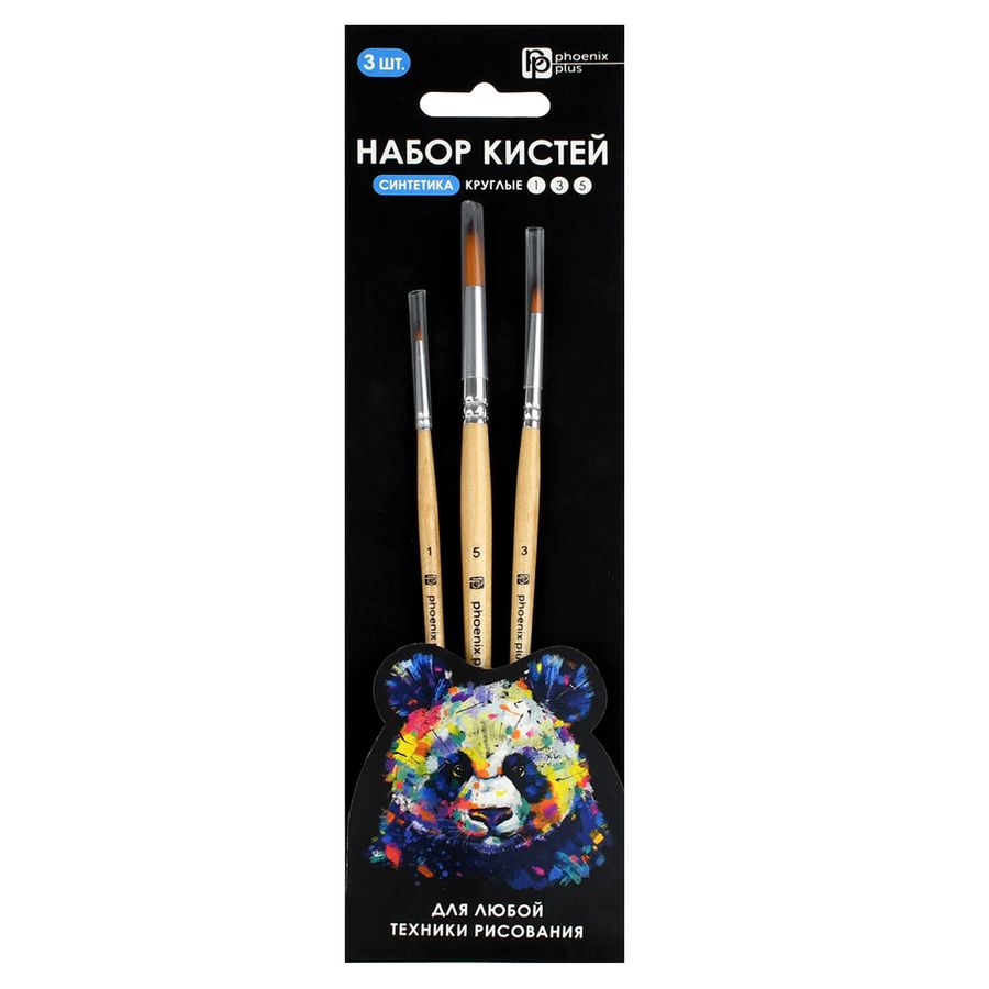 Набор художественных кистей арт. 71455 / 25 ПАНДА (нейлон, 3 шт., круглые № 1, 3, 5, материал ручки: древесина (береза), материал обоймы: алюминий, картонная подложка + ПЭТ-пакет).