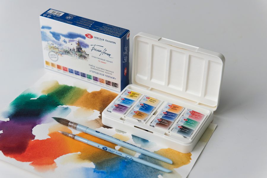 Производитель акварели БЕЛЫЕ НОЧИ - широко известный в России завод "Невская палитра". Акварель БЕЛЫЕ НОЧИ - мелкодисперсные суспензии пигментов в растительном связующем гуммиарабике. За счет использования высококачественных компонентов и проверенной технологии производства краски характеризуются насыщенностью и чистотой цветов, они малочувствительны к свету и замечательно наносятся на бумагу. Акварель практически не теряет свой первоначальный вид со временем. Набор упакован в пластиковую коробку с палитрой, что позволяет разместить все краски в одной руке. Такая коробочка будет незаменима на пленэре.