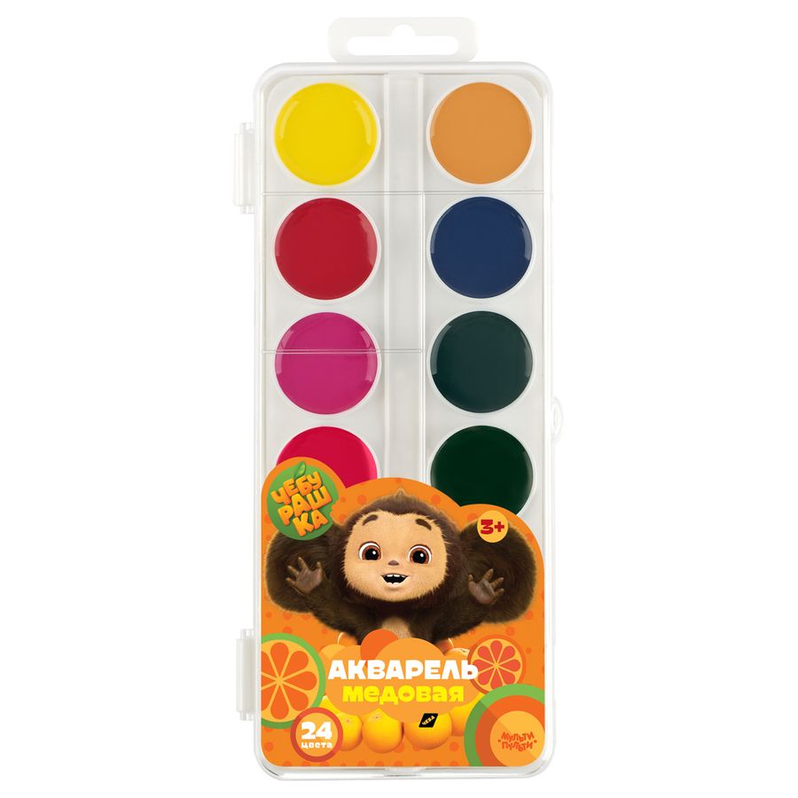 Детские медовые акварельные краски «Мульти-Пульти» серии «Чебурашка» предназначены для детей старше 3-х лет и отлично подойдут для творчества в школе или детском саду. Кюветы круглой формы разделены между собой для удобства при рисовании. Объем кюветы – 3,5 см3. В наборе 24 насыщенных цвета без кисти. Акварельные краски обладают хорошей укрывистостью и остаются яркими при высыхании. Смешивание цветов даёт чистые оттенки. Натуральные компоненты гарантируют безопасность для здоровья детей.Пластиковая упаковка удобна в использовании, а наклейка с любимым героем Чебурашкой делает набор красок позитивным и запоминающимся. • Количество цветов: 24;• Форма кюветы: круглая;• Объем кюветы: 3,5 см3.
