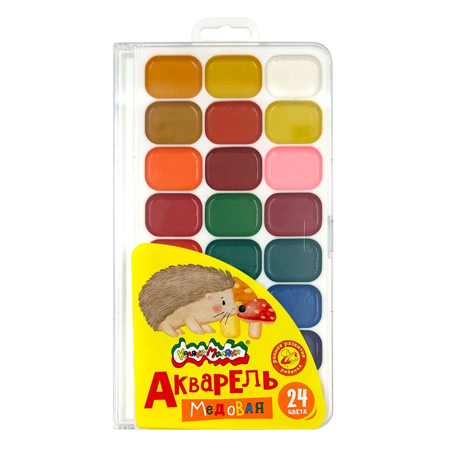 Акварель Каляка-Маляка® имеет идеально подобранную цветовую гамму, необходимую для развития творческих способностей ребенка. С ее помощью малыш учится пользоваться палитрой, определять теплые и холодные цвета. 24 ярких насыщенных цвета отлично смешиваются между собой и позволяют создать множество оттенков. Краски быстро высыхают и не портятся со временем. Изготовлены на основе натуральных компонентов, не содержат токсичных веществ. Безопасны при использовании по назначению. Выпускаются в пластиковой упаковке с европодвесом и прозрачной крышкой, квадратной формой кювет и отделением для кисточки. Упаковка обладает удобной формой-палитрой и легким весом. Размер 20x10,5x1,5 см. Акварель обладает высоким качеством: