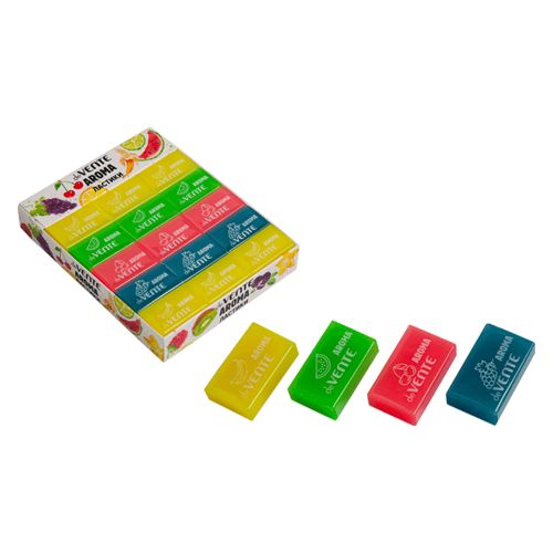 Ластик "deVENTE. Fruit cocktail" синтетический (ECO-PVC), ароматизированный, прямоугольный прозрачно-тонированный с запечаткой, 39x24x12 мм, ассорти 4 цвета, dust-free, в индивидуальной упаковке со штрих кодом, в картонном дисплее