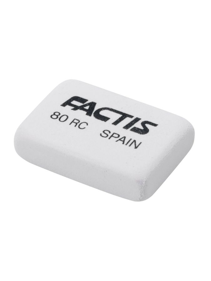 Ластик FACTIS 80 RC прямоугольной формы, белого цвета с рисунком. Изготовлен из высококачественного, эластичного, синтетического каучука. Используется для удаления штрихов, сделанных чернографитным карандашом любой твердости со всех типов бумаги. Классическая прямоугольная форма и средний размер ластика обеспечат продолжительный срок службы. Размер ластика 28х20х7 мм.