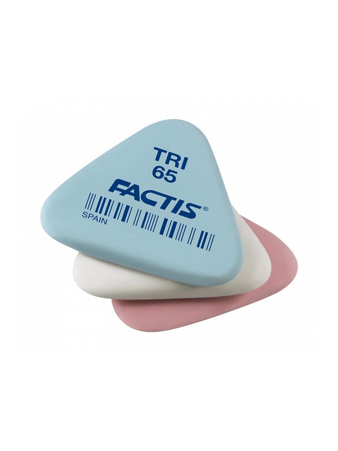 Ластик FACTIS TRI 65 треугольной формы, трех цветов: белый, голубой, розовый. Изготовлен из высококачественного, мягкого синтетического каучука. Используется для удаления штрихов, сделанных чернографитным карандашом любой твердости со всех типов бумаги. Благодаря треугольной форме хорошо стирает тонкие линии и заштрихованные участки. Маркировка штрих-кода на каждом ластике. Размер ластика 36 х 33 х 6 мм.