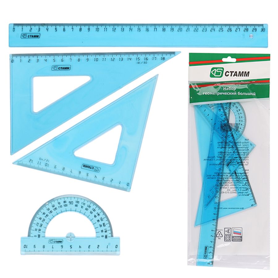 Чертежный набор из сертифицированного полистирола включает четыре предмета. Предназначен для чертёжных работ. Состав набора: 1. Линейка со шкалой 30 см. 2. Угольник с углом 30° и шкалой 18 см. 3. Угольник с углом 45° и шкалой 12 см. 4. Транспортир 180° с линейкой 10 см.