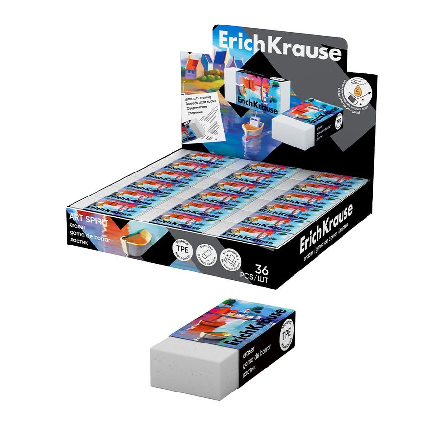 Супермягкий ластик прямоугольной формы из современного материала термопластичного эластомера (TPE) с пониженным образованием крошек (Dust free) до одной крошки обеспечит идеально чистое стирание. Ластик не оставляет разводов на бумаге даже при попадании масляных и жирных капель, крема на ластик. Не содержит ПВХ, латекса и фталатов. Каждый ластик имеет индивидуальный штрих-код. Размер 45 x 21 x 11 мм.