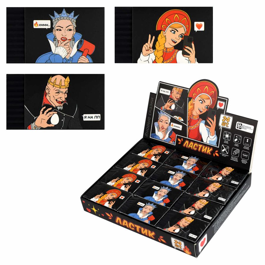 Ластик , арт.70037/ 24 НОВЫЕ СКАЗКИ (шоу-бокс, 24 шт., ассорти, чёрный, 52х30х10 мм, ПВХ, форма: прямоугольная, ПЭТ-плёнка + картонная обертка).