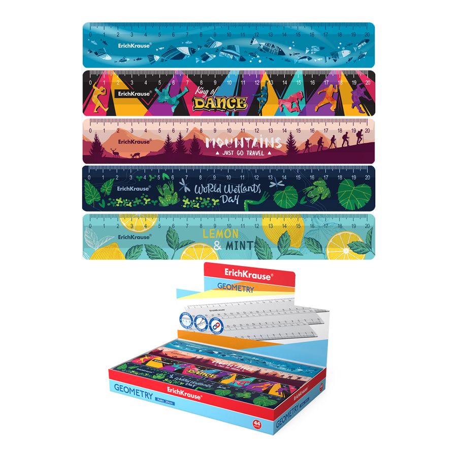 Линейка из высококачественного пластика. Односторонняя шкала и рисунок нанесены на термопленку. Длина разметки – 20см. Ассорти: Sea World, Mountains, King of Dance, Wetlands, Lemon&Mint.