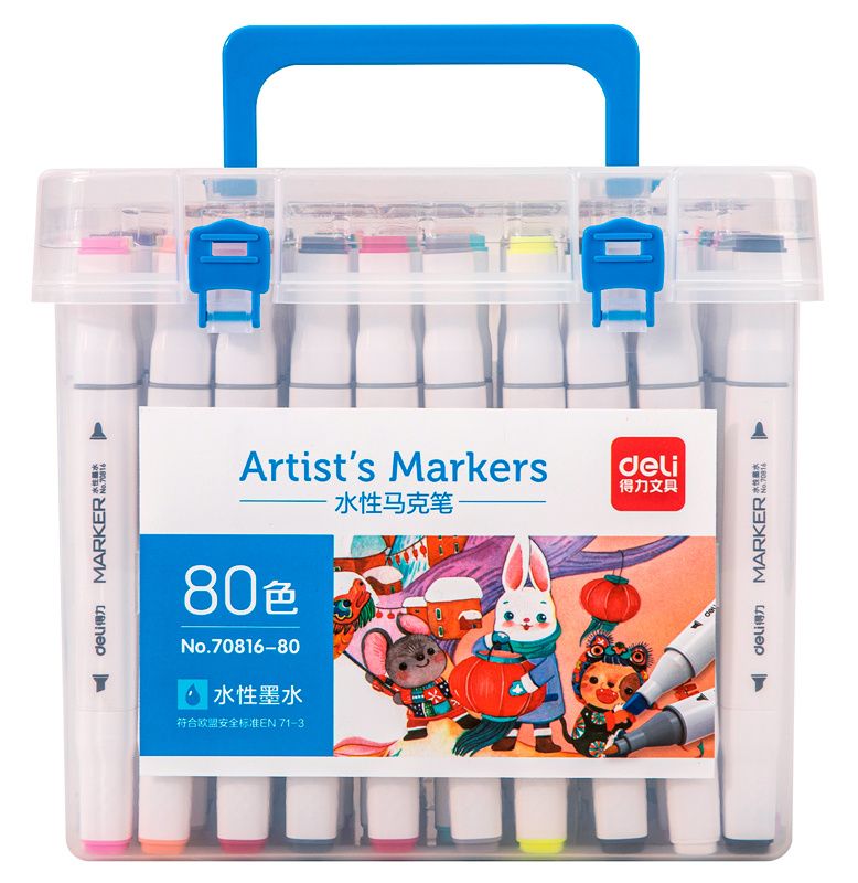 Маркеры для скетчинга Deli 70816-80, чернила на водной основе, квадратная форма, двухсторонние, 80 цв.
