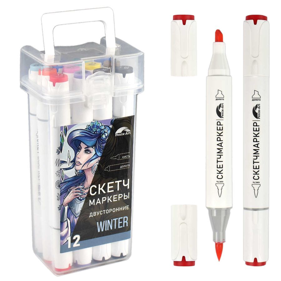 Набор скетчмаркеров двусторонних арт. 65498 / 2 ЗИМА (12 цв., размер бокса: 8х16,5х6,4 см, цвет корпуса: белый, материал: полипропилен, полиэстер "Фетр", нейлон, состав чернил: на спиртовой основе, толщина наконечников: "долото" - 6,2 мм, "кисть" - 1-6 мм, раскладка для выкраски цветов в комплекте, пластиковый бокс с полноцветным стикером + картонная коробка).