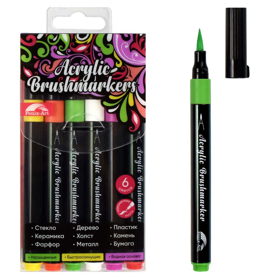 Набор браш-маркеров арт. 64532 / 24 ВЕСНА (6 цветов (штук) в наборе, размер: 7,5х14,2х1,3 см, полипропилен, фибра (полиамид), форма наконечника: кисть, отделка: термотрансферная печать, ПЭТ-коробка с европодвесом).