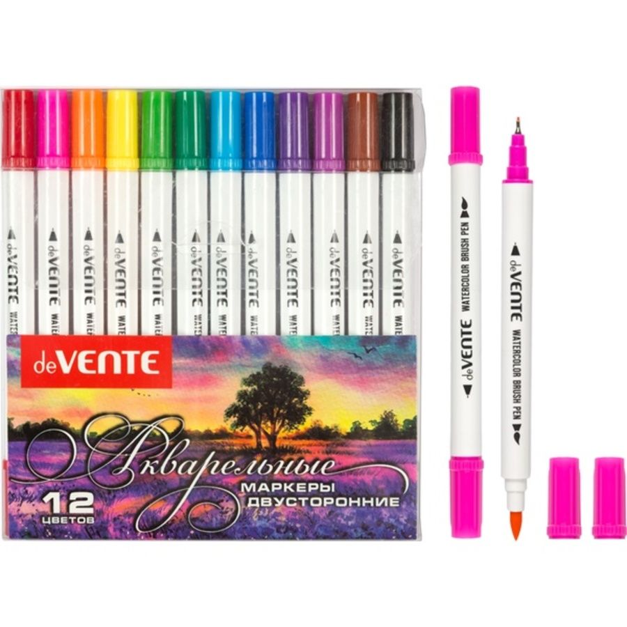 Маркеры акварельные "deVENTE" 12 цветов, двусторонние (кистевидный до 2 мм/пулевидный в металлической обойме 0,4 мм), круглый корпус, акварельные чернила на водной основе, в пластиковой коробке