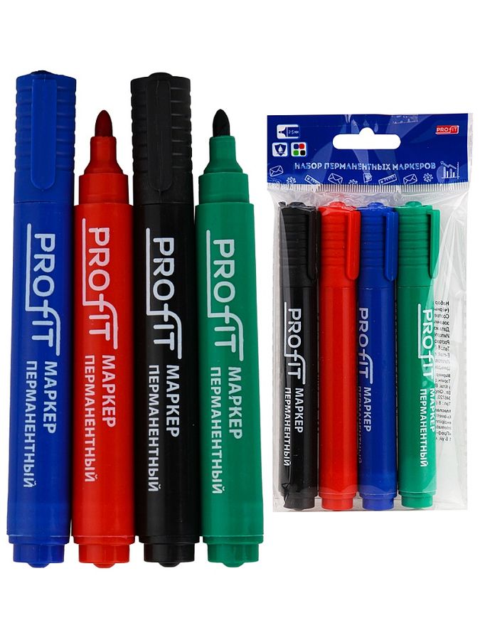 Набор из четырех маркеров с чернилами на основе спирта. Перманентный маркер предназначен для письма на любой поверхности: бумага, полиэтилен, дерево, стекло, металл, натуральная кожа, ткань, камень, плитка. Быстро высыхает и не размазывается. Толщина линии 2,5 мм.