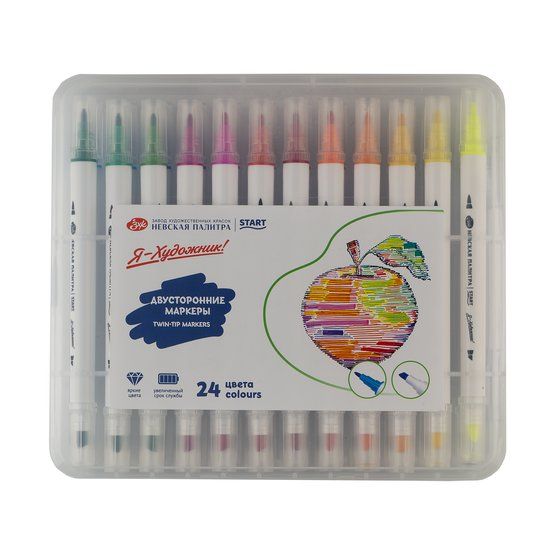 Маркеры двухсторонние. Два вида наконечника: широкое перо/пуля Длина корпуса - 14,6 см, толщина корпуса 0,9 см, толщина линии пера до 4 мм, толщина линии пули до 2 мм. Яркие цвета.Долгий срок службы Состав цветов: Желтый, желтый темный, желтый неоновый, оранжевый, оранжевый яркий, красный, алый, розовый, фуксия, изумрудный, салатовый, зелёный, голубой, синий, голубой светлый, ультрамариновый, синий, сиреневый, фиолетовый, фиолетовый яркий, умбра, коричневый, коричневый тёмный, серый, черный.