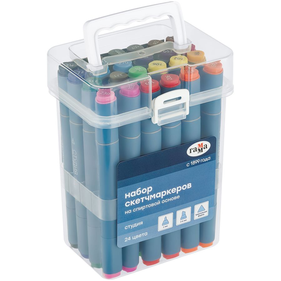 Набор двусторонних маркеров для скетчинга ГАММА серии «Студия» – выбор профессионалов, любителей и начинающих художников, дизайнеров и иллюстраторов. В наборе 24 цвета. Перманентные чернила на спиртовой основе не токсичны и быстро сохнут на поверхности, оставляя яркий след. Маркеры на спиртовой основе имеют два наконечника: пулевидный с шириной линии 1 мм и долото (клиновидный) 2-6 мм. Пулевидный наконечник подойдет для прорисовки деталей, работ в различных графических техниках, создания текстур и проработки контуров. Клиновидный наконечник идеален для работ на больших поверхностях и тех, кто занимается каллиграфическими техниками, так как он позволяет варьировать ширину линии. Маркеры для рисования мягко ложатся на поверхность, создавая ровный цвет без разводов. Цвета отлично смешиваются между собой, образуют плавные переходы и новые оттенки. Маркерами можно рисовать на бумаге, холсте и других поверхностях. Трехгранный матовый корпус диаметром 1, 55 мм из полипропилена нежно-голубого цвета легкий и ударопрочный. Плотно защелкивающийся колпачок обеспечивает долгую сохранность чернил от высыхания. Также на нём указан номер цвета. Маркерам не страшны морозы, так как спирт замерзает только при температуре –114 °C. Набор упакован в пластиковый кейс с разделителями и защелками. • Количество цветов: 24; • Тип наконечника: пулевидный/клиновидный; • Ширина линии письма: 1 мм/2-6 мм; • Основа: спиртовая; • Форма корпуса: трёхгранная.