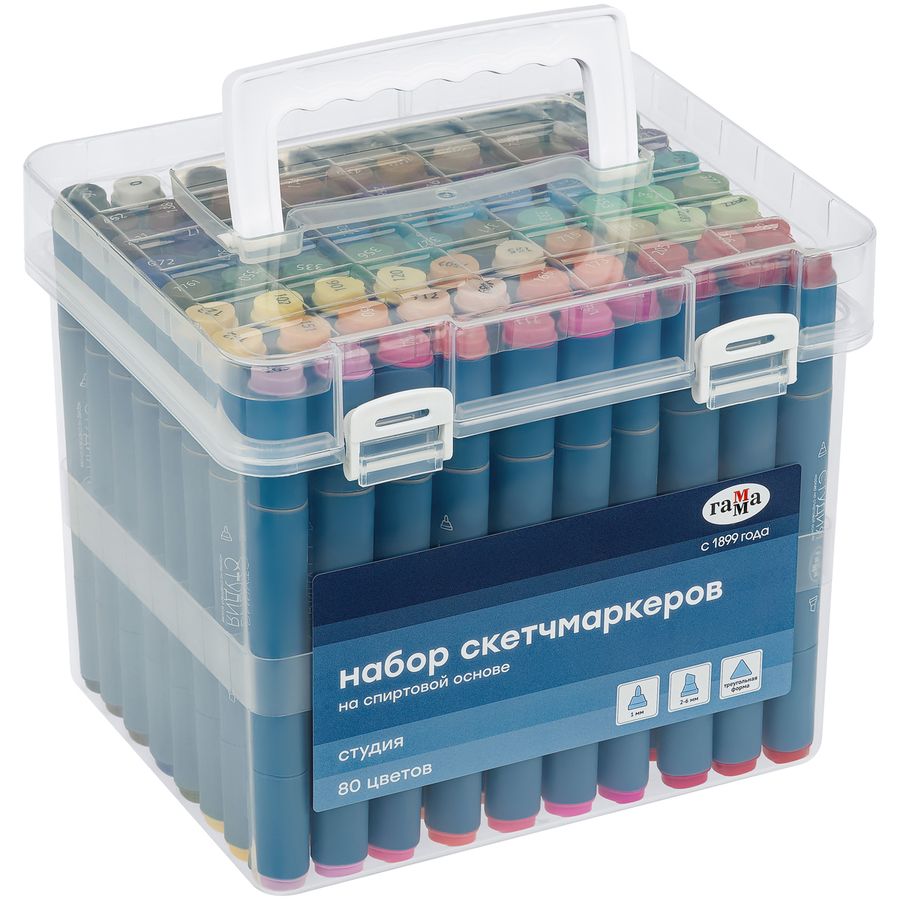 Набор двусторонних маркеров для скетчинга ГАММА серии «Студия» – выбор профессионалов, любителей и начинающих художников, дизайнеров и иллюстраторов. В наборе 80 основных цветов. Перманентные чернила на спиртовой основе не токсичны и быстро сохнут на поверхности, оставляя яркий след. Маркеры на спиртовой основе имеют два наконечника: пулевидный с шириной линии 1 мм и долото (клиновидный) 2-6 мм. Пулевидный наконечник подойдет для прорисовки деталей, работ в различных графических техниках, создания текстур и проработки контуров. Клиновидный наконечник идеален для работ на больших поверхностях и тех, кто занимается каллиграфическими техниками, так как он позволяет варьировать ширину линии. Маркеры для рисования мягко ложатся на поверхность, создавая ровный цвет без разводов. Цвета отлично смешиваются между собой, образуют плавные переходы и новые оттенки. Маркерами можно рисовать на бумаге, холсте и других поверхностях. Трехгранный матовый корпус диаметром 1, 55 мм из полипропилена нежно-голубого цвета легкий и ударопрочный. Плотно защелкивающийся колпачок обеспечивает долгую сохранность чернил от высыхания. Также на нём указан номер цвета. Маркерам не страшны морозы, так как спирт замерзает только при температуре –114 °C. Набор упакован в пластиковый кейс с разделителями и защелками. • Количество цветов: 80; • Тип наконечника: пулевидный/клиновидный; • Ширина линии письма: 1 мм/2-6 мм; • Основа: спиртовая; • Форма корпуса: трёхгранная.